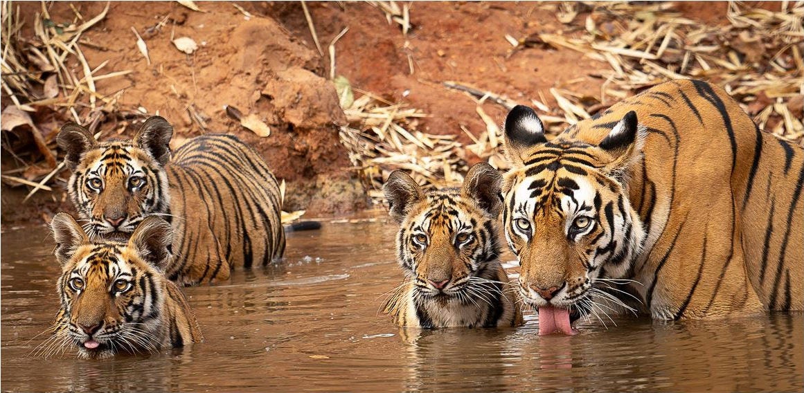 En 1910, había más de 80 000 tigres en la India, pero un siglo después eran apenas 1700. Hoy, la cifra se acerca ya a los 4000 gracias a los esfuerzos de conservación y al potencial de expansión de la propia especie: una hembra tiene hasta siete cachorros cada dos años. La de esta imagen, ganadora de los 1839 Awards, disfruta del agua junto a sus tres retoños.